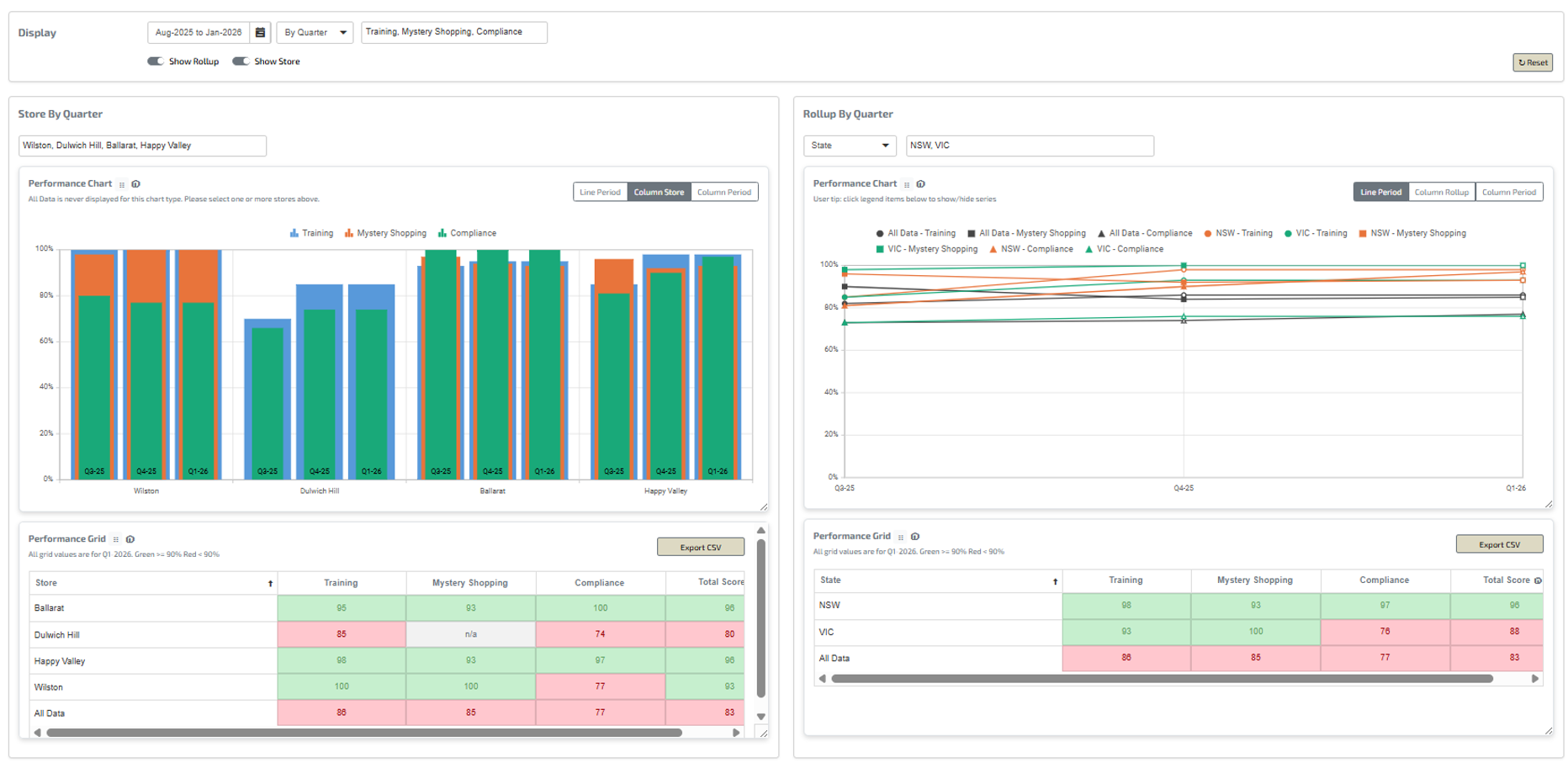 The REX Analytics Dashboard provides visibility into individual store performance and operational efficiency by analysing the operational and performance data that matters to your business, including compliance, training, mystery shopping, and sales performance. The Analytics Dashboard helps leaders quickly identify gaps and benchmark results— improving both customer experience and driving sales growth. |