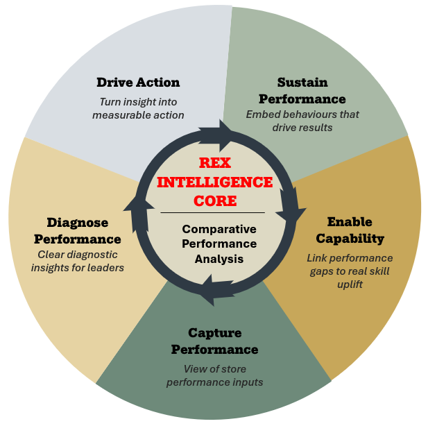 Built on a five-pillar framework, REX supports a Track–Train–Reward methodology that connects performance visibility with capability development and behavioural reinforcement. REX captures and analyses store data to identify performance gaps and opportunities (Track), links those insights to structured action plans and targeted training pathways (Train), and embeds recognition and governance mechanisms to reinforce the behaviours that drive sustained performance improvement (Reward).